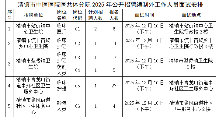 根据《清镇市中医医院医共体分院2025年公开招聘编制外工作人员简章》,报名人数不超过30人(含30人)的岗位直接采取面试方式进行,面试成绩即为总成绩。结合报名情况和岗位需求,此次招聘岗位均采取面试方式进行测试。